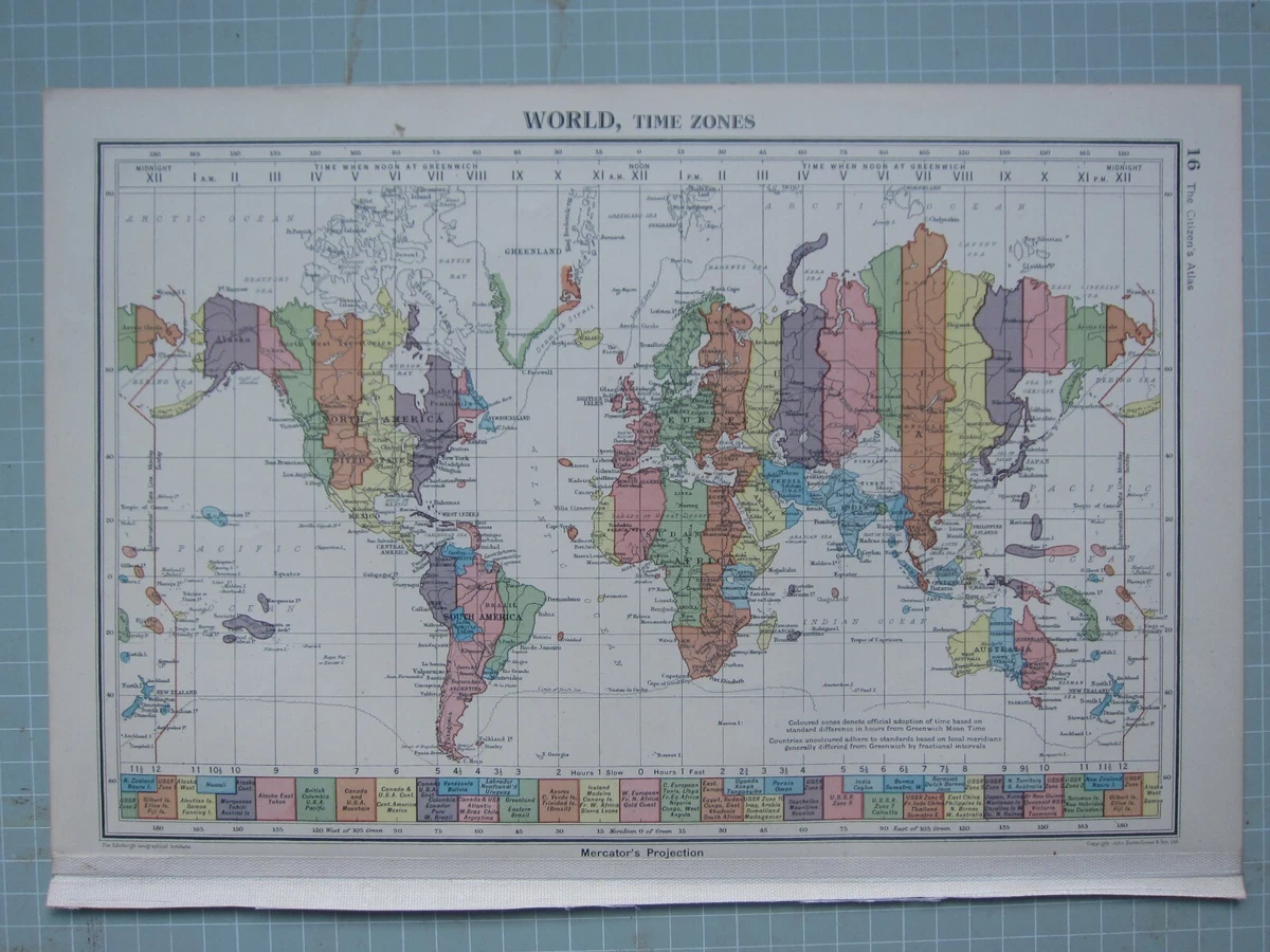 1943 MAP WORLD TIME ZONES NORTH & SOUTH AMERICA EUROPE ASIA